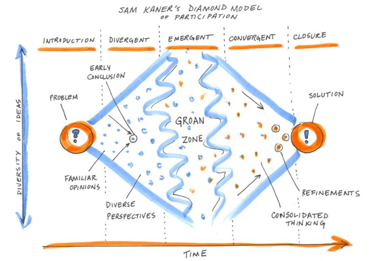 The presenters drew on a familiar participatory model that describes how groups move from divergence to convergence. In early stages, ideas proliferate. Perspectives multiply. Creativity flourishes over time but so does confusion. This leads us to what is called the “groan zone.”